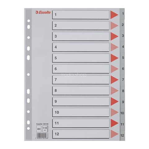 Regiszter, műanyag, A4, 1-12, ESSELTE, szürke - a minőségi műanyag alapanyagból készült regiszterek az iratok hatékonyabb és időtállóbb rendszerezését és visszakeresését szolgálják - 11 lefűzőlyukkal rendelkeznek - méret: A4 - szürke szín Gyártó/el