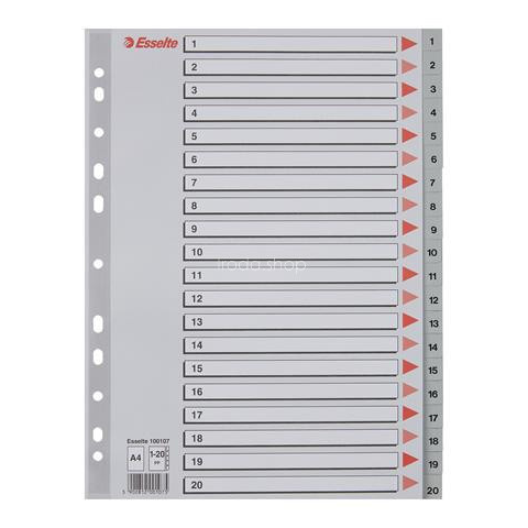Regiszter, műanyag, A4, 1-20, ESSELTE, szürke - szürke színű regiszter - nagyméretű téglalapok az előlapon a tartalom feltüntetésére - megerősített lefűzőrész az előlapon - 1-20 felirattal rendelkező regiszter fülek a dokumentumok gyors eléréséhez - 0