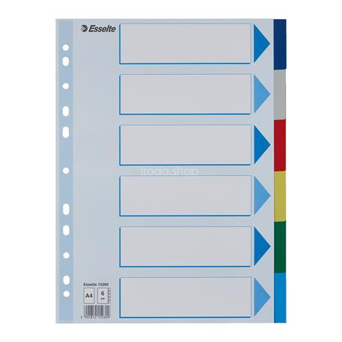 Regiszter, műanyag, A4, 6 részes, ESSELTE - elválasztólap visszafogott színkombinációkban - nagyméretű téglalapok az előlapon a tartalom feltüntetésére - 0,12 mm vastag PP alapanyag - hagyományos, 11-lyukú lefűzőrész - 6 színes fül a könnyű rendszerez