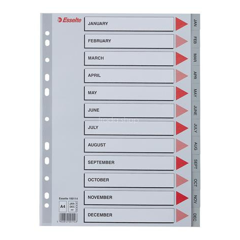 Regiszter, műanyag, A4, Jan-Dec, ESSELTE, szürke - szürke színű regiszter - nagyméretű téglalapok az előlapon a tartalom feltüntetésére - Jan-Dec felirattal rendelkező regiszter fülek a dokumentumok gyors eléréséhez - megerősített lefűzőrész az előlapo