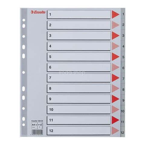 Regiszter, műanyag, A4 Maxi, 1-12, ESSELTE, szürke - szürke színű regiszter - nagyméretű téglalapok az előlapon a tartalom feltüntetésére - megerősített lefűzőrész az előlapon - hagyományos, 11-lyukú lefűzőrész - 0,12 mm vastag PP alapanyag - az A4+ mé