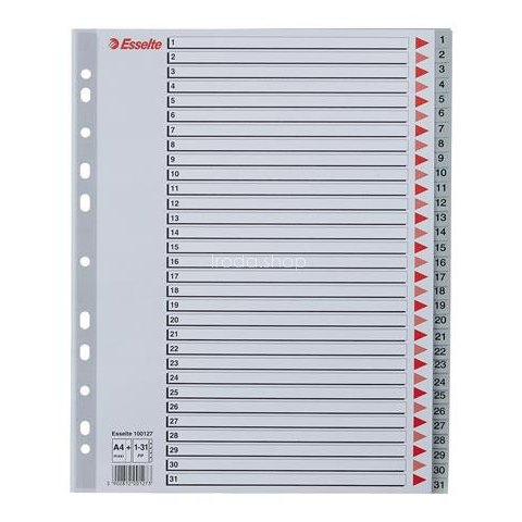 Regiszter, műanyag, A4 Maxi, 1-31, ESSELTE, szürke - szürke színű regiszter - nagyméretű téglalapok az előlapon a tartalom feltüntetésére - megerősített lefűzőrész az előlapon - hagyományos, 11-lyukú lefűzőrész - 0,12 mm vastag PP alapanyag - az A4+ mé