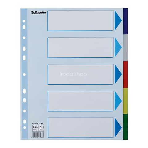 Regiszter, műanyag, A4 Maxi, 5 részes, ESSELTE - elválasztólap visszafogott színkombinációkban - nagyméretű téglalapok az előlapon a tartalom feltüntetésére - 0,12 mm vastag PP alapanyag - hagyományos, 11-lyukú lefűzőrész - 5 színes fül a könnyű rends