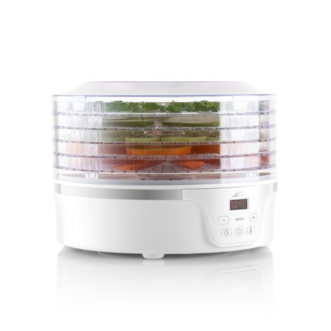 Egészséges módszer az ételek elkészítésére és tartósítására Ideális gyümölcsök, zöldségek, gombák, húsok, halak (házi "jerky") vagy gyógynövények házi szárításához Gombos vezérlés LED kijelzővel a hőmérséklet és idő egyszerű beállításához Hőmérséklet 35 - 70 °C között, 5 °C-os lépésekben Fűtés nélküli különálló ventilátor funkció lehetősége Időzítő 30 perctől 24 óráig, 30 perces lépésekben 5 szárító tálca (Bpa mentes) 1