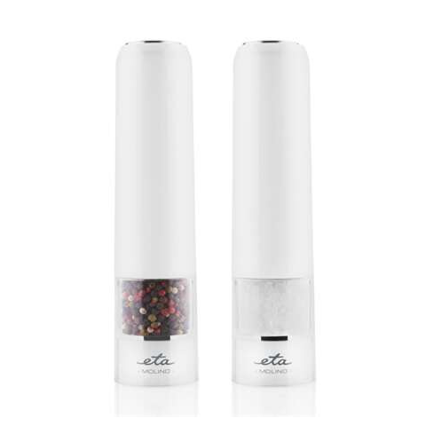 Fűszerdaráló - elektromos, állítható őrlési finomság, megvilágított daráló kimenet és átlátszó tartály, műanyag konstrukció, kerámia őrlőmechanizmus, akkumulátoros tápellátás, használatához 6 AAA elem szükséges elem szükséges, 2 daráló a csomagban, mérete 21 × 5,5 × 5,5 cm (Ma×Sz×Mé), tömege 500 g ETA Molino 0928 90000 fűszerdarálóAz elegáns étkezésekhez válaszd az ETA fűszerőrlőit. Ezek az elektromos fűszerdarálók fehér színüknek és vis