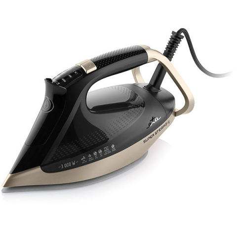 Vasaló - gőzölős, ruhához, 3000 W teljesítmény, gyorsmelegítés, csapvíz használata és vízkőtelenítés, 450 ml-es tartály, 60 g/perc gőzkibocsátás, 200 g/perc gőzlövet, kerámia vasalótalp, kábel hossza 3 m, fekete és arany kivitel