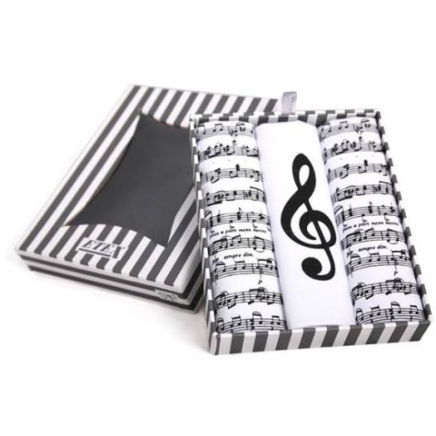 3 db kotta mintás női textilzsebkendő díszdobozban A zsebkendő tulajdonságai Anyag: 100% pamut Méret: 28 x 28 cm Mennyiség: 3 db / díszdoboz Színek: fehér alapon fekete nyomott minta Minták: egyedi kotta minta (zenei motívum) Csomagolás: díszdoboz Kiváló minőségű cseh férfi, női és gyerek textilzsebkendők széles választékban elérhetők a webáruházunkban.
