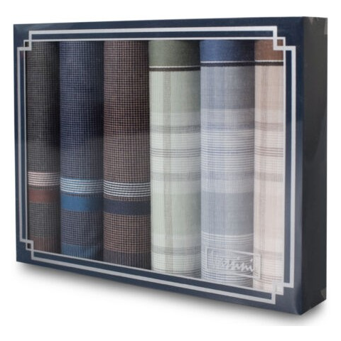 6 darabos elegáns férfi textilzsebkendő szett díszdobozban Egy klasszikusan elegáns zsebkendőcsomag hétköznapi és alkalmi használatra. Kiváló kezdő- vagy pótló készlet minden korosztály számára. A zsebkendőcsomag főbb jellemzői Anyag: 100% pamut Méret (textilzsebkendő): kb. 40 x 40 cm Mennyiség: 6 db / doboz Színek és minták: kétféle stílus- és színkombináció egy dobozban: 3 db sötét színű (kék, szürke, bordó) apró kockás (szövet-minta) text