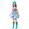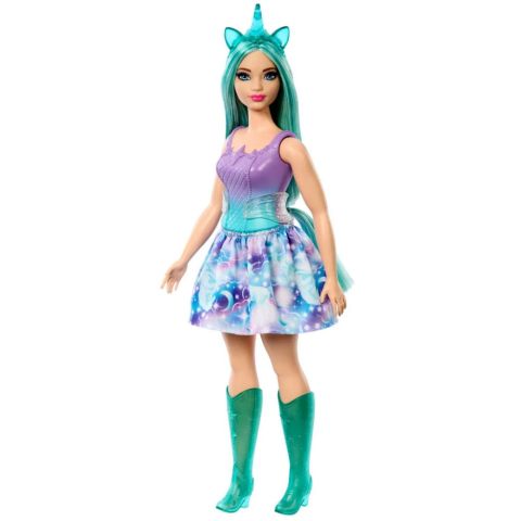 Mattel, Barbie Dreamtopia Unikornis baba A Barbie Dreamtopia hercegnő babája gyönyörű kék csizmában, kék hajjal és unikornis szarvval érkezik, ami varázslatos kék-lila égbolt mintás ruhájával harmonizál. A csizma és a hajszín tökéletesen passzolnak egymás