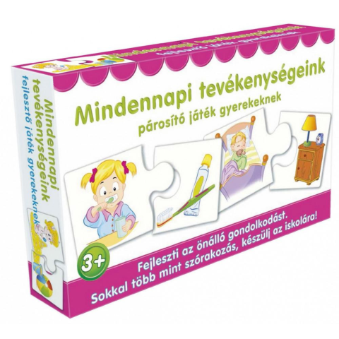 RAKTÁRRÓL AZONNAL! Mindennapi tevékenységeink - Fejlesztő játék Tartalma: 12 pár puzzle (24 db puzzle kártya) Anyaga: papír Doboz mérete: 28,3x17,5x4,3 cm Használata 3 éven felülieknek ajánlott.