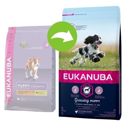 Puppy Medium Az Eukanuba Growing Puppy Medium Breed csirke eledelt a közepes termetű, fejlődésben lévő kiskutyák - mint pl. a cocker spániel, collies, tacskó vagy beagles - sajátos tápanyagigénye szerint alakították ki. A Eukanuba Puppy Medium 10 - 22 kg felnőttkori súlyú, közepes termetű fajták kölykei számára gondoskodik egészséges növekedésről életük első 12 hónapjában. A 15% friss csirkét is magában foglaló szárnyashúsban gazdag száraztáp külön