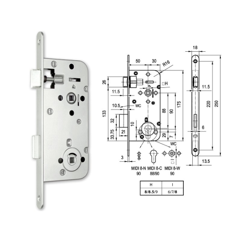 Egycsukású WC zár. Kivitel: kerekített előlap: horganyezüst felületkezelés, zárszekrény: natúr. Egyszerű csapdaátállítás. A zártesten lévő DIN átmenő furatok lehetővé teszik osztott és biztonsági veretgarnitúra felszerelését. A termék szilárdságilag
