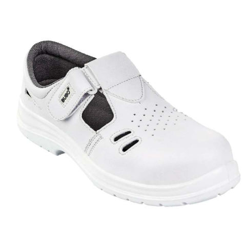 BUBI Tépőzáras szandál O1 fehér Biztonsági orrmerevítő nélküli tépőzáras szandál Az alsórésze csúszásgátló és üzemanyagálló PU talp Energia elnyelő sarok, amely rendkívűl kényelmes viseletet biztosít. A felsőrész mikroszálas, a bélés SANITIZED antibakt