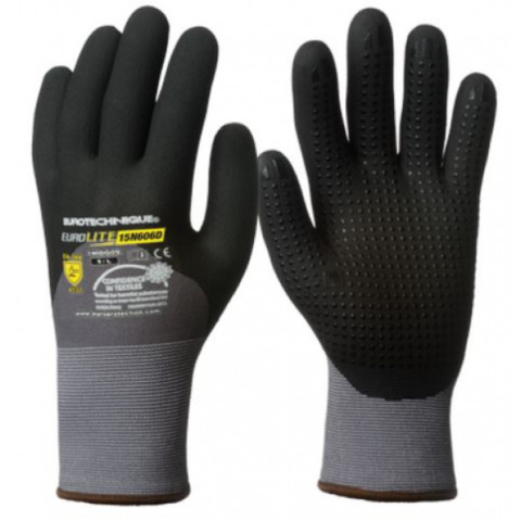 EUROLITE 15N606 FEKETE NITRIL MÁRTOTT KESZTYU:15-ös kötésű, erős szakítás- és kopásállóságú szürke nylon / spandexökölcsontig fekete szellőző mikrohabosított nitrillel mártott, tenyerén csúszásbiztos pettyekkelszellőző kézhát, gumírozott mandzsettakönnyű, kiemelten komfortos, teljesen kézre simuló formai kialakítás, tenyerén és a kézháton is biztosított szellőzésselÖko-Tex minősítésszéles méretszortimentMÉRET: 6-osCSOMAGOLÁS: 100/10 ? páranként