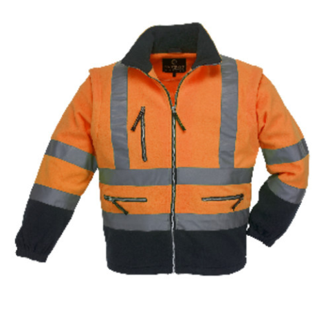 330 g/m2 vastag, bolyhosodásmentes thermo-polár, kettő az egyben: levehető ujjakkal polár mellénnyé alakítható, fluo jól láthatósági anyag, hosszanti és keresztirányú fényvisszaverő csíkokkal, gumizott ujjvégek, zsinórral állítható aljrész, álló gallé
