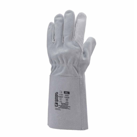 Puha kecskebőr tenyerű heggesztőkesztyű Kecske színbőr tenyérrel és marha hasítékbőr hátrésszel készűl Para-aramid szálas varrás, gumírozott hátrész 15 cm hosszú biztonsági mandzsetta hasított bőrből Kényelmes és fogásbiztos kialakítás Antisztatikus tu