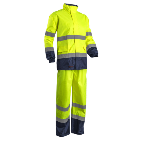 180 g/m2 lélegző (2000 mvp) poliuretánnal bevont, vízhatlan (2000 mm) Oxford poliészter, 5 cm széles fényvisszaverő csíkok, hegesztett biztonsági varratok, kabát: végig cipzáras álló gallér, rejtett kapucni, két oldalzseb, állítható alj, nadrág: gumír