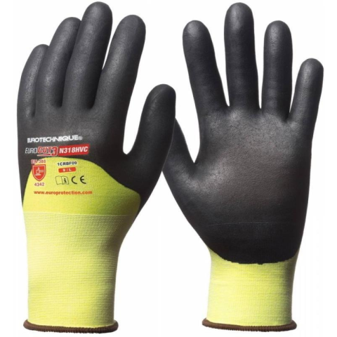 EUROCUT 3 N318HVC 3/4 NITRIL MÁRTOTT KESZTYU:18-as kötésű, legmagasabb szakítás- és kopásállóságú és 3-as szinten vágásbiztos fluo sárga HPPE + nylon kesztyűökölcsontig fekete szellőző mikrohabosított nitrillel mártott védőkesztyű megnövelt élettartammal?második bőr? érzetű tapintási jellemző, teljesen kézre simuló formai kialakítás, páratlan kényelemmel, kiemelkedő csúszásbiztossággal és tapadással olajos környezetben isszellőző tenyér és kézh