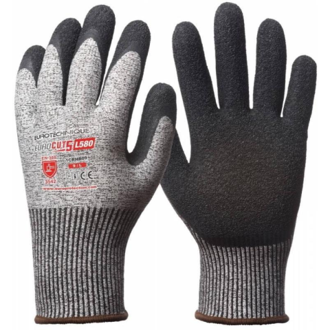 EUROCUT 5 L580 FEKETE KREPP LATEX KESZTYU:13-as kötésű, legmagasabb színtű szakítás- és kopásállóságú, szúrásbiztos illetve maximális 5-ös szinten vágásbiztos HPPE (high performance PE) + üvegszál alapanyagú védőkesztyűtenyerén fekete krepp latex mártott védőkesztyű megnövelt élettartammalkönnyű, extra kényelmes, teljesen kézre simuló formai kialakítás, extra csúszásbiztossággal száraz és nedves környezetbengumírozott, rugalmas mandzsettaszéles mér