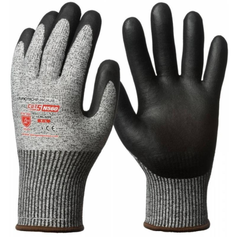 EUROCUT 5 N560 TENYÉREN FEKETE NITRIL MÁRTOTT KESZTYU:13-as kötésű, legmagasabb színtű szakítás- és kopásállóságú, szúrásbiztos illetve maximális 5-ös szinten vágásbiztos HPPE (high performance PE) + üvegszál alapanyagú védőkesztyűtenyerén szellőző fekete mikrohabosított nitril mártott védőkesztyű megnö