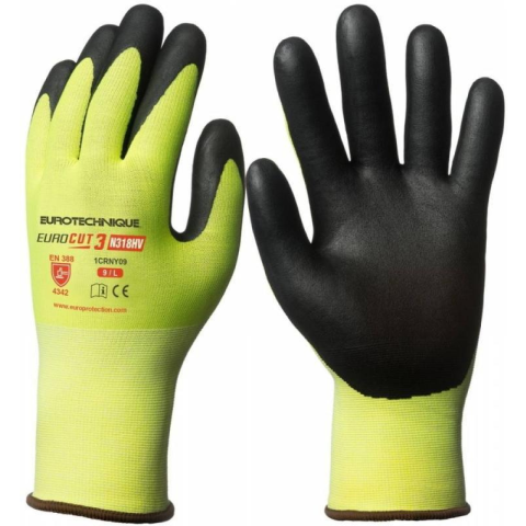 EUROCUT 3 N318HV HIVIZ NITRIL MÁRTOTT KESZTYU:18-as kötésű, legmagasabb szakítás- és kopásállóságú és 3-as szinten vágásbiztos fluo sárga HPPE + nylon kesztyűtenyerén fekete szellőző mikrohabosított nitril mártott védőkesztyű megnövelt élettartammal?második bőr? érzetű tapintási jellemző, teljesen kézre simuló formai kialakítás, páratlan kényelemmel, kiemelkedő csúszásbiztossággal és tapadással olajos környezetben isszellőző tenyér és kézhát, g