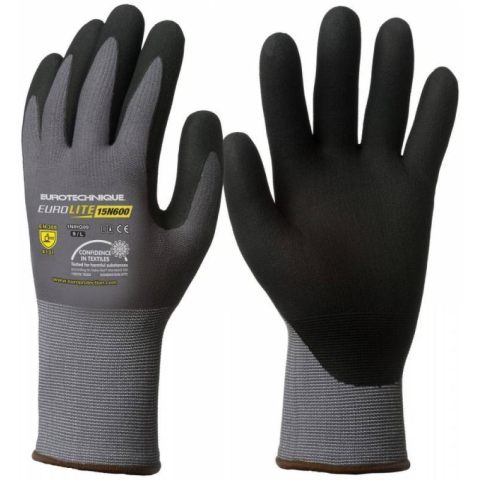 EUROLITE 15N600 FEKETE NITRIL MÁRTOTT KESZTYU:15-ös kötésű, erős szakítás- és kopásállóságú szürke nylon / spandextenyerén fekete szellőző mikrohabosított nitrillel mártottszellőző kézhát, gumírozott mandzsettakönnyű, kiemelten komfortos, teljesen kézre simuló formai kialakítás, tenyerén és a kézháton is biztosított szellőzésselÖko-Tex minősítésszéles méretszortimentméret: 6-oscsomagolás: 100/10 ? páranként külön csomagolvaEU szabvány: EN420, EN