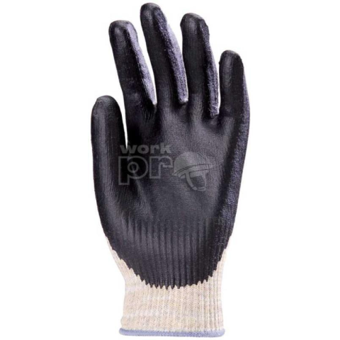 EUROSAFE MULTISZÁLAS EMELT SZINTEN VÁGÁSBIZTOS KEVLAR TENYÉREN FEKETE NITRIL MÁRTOTT KESZTYU: EUROSAFE10-es kötésű, multiszálas védőkesztyű: rendkívüli kopásállóságú és szakítószilárdságú, 5-ös szintű, kiemelten vágásbiztos alapanyagok (Kevlar?-, szintetikus-, üveg- és fémszálak)tenyéren fekete nitril mártásgumírozott, rugalmas mandzsetta, szellőző kézhátméret: 7-escsomagolás: 100/10EU szabvány: EN420, EN388: 4543