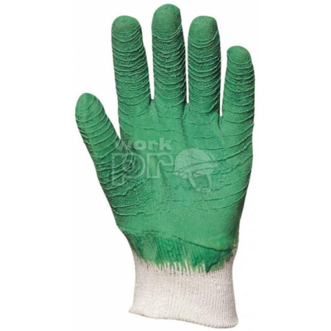 MÁRTOTT ZÖLD ECOLINE KREPP LATEXKESZTYU:Ecoline? változatpamutra ökölcsontig mártott zöld latex, vízbázisú, oldószermentesbőrbarát, gumírozott mandzsettakopás- és vágásbiztos, 1,8 mm vastag, nagy igénybevételre tervezett védőkesztyűmegerősített csúszás elleni érdesítésméret: 8-ascsomagolás: 72/12EU szabv&aa