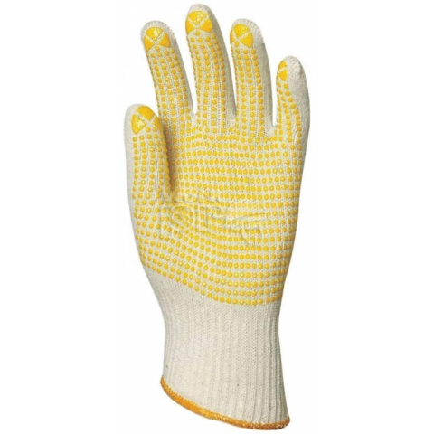 SÁRGA PETTYES, DUPLASZÁLAS KESZTYU:duplaszálas, 10-es kötésű, 100% pamutcérnatenyerén csúszás elleni pöttyözésgumírozott mandzsetta, kiváló szellőzés és nedvszívásSÚLY: 50 gMÉRET: 7-esCSOMAGOLÁS: 250/10EU szabvány: EN420, EN388: 012X
