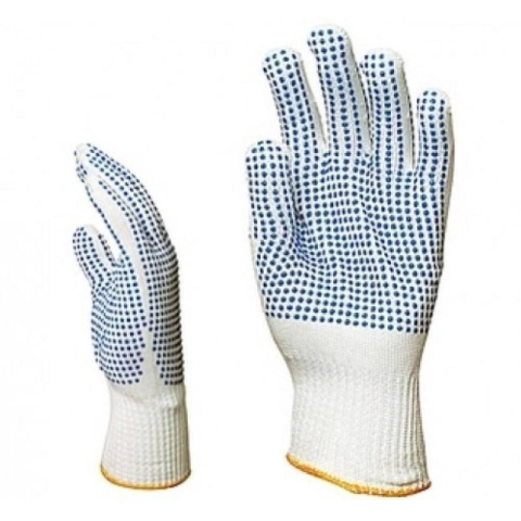 KÖTÖTT POLIAMID KESZTYU, PAMUT BELSO, TENYÉREN KÉK PETTYEK:kötött poliamid/pamutközepes vastagságú, rugalmasan kézre simuló, szöszmentes, kopásálló kesztyűcsúszás elleni pöttyök a tenyérenSÚLY: 45 gMÉRET: 7-esCSOMAGOLÁS: 200/10EU szabvány: EN420, 1. kat