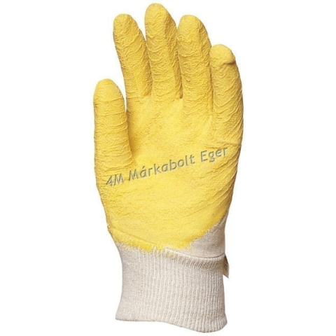 3800 szövött pamut alapkesztyűre ökölcsontig mártott sárga latex • gumírozott mandzsetta, szellőző kézhát • csúszásmentes érdesítés • 3801: biztonsági, merev mandzsettás, belül végig bélelt, erősített változat • méret: 10-es • csomagolás: 120/12 EU szabvá