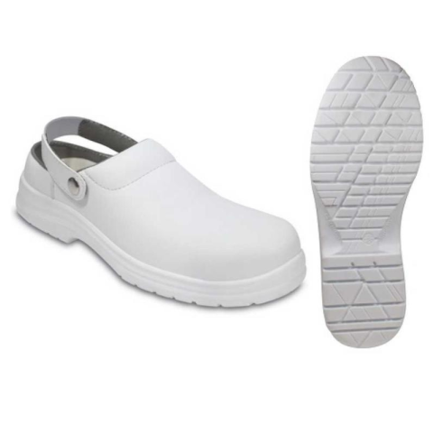 OKENITE (SB SRC) KLUMPA:fehér, antisztatikus védőlábbeli, vízlepergető és szellőző mikroszálas felsőrésszel, kompozit orrmerevítővel, sarokpánttalbevizsgált és nedves, tisztítószeres kerámia és acél felületre (SRC) minősített, csúszásbiztos, hajlékony, kétrétegű PU talpnagy kopásállóságú, szénhidrátvegyületeknek, növényi olajoknak, állati zsíroknak, lúgoknak ellenálló, fehér talppuha, szivacsos felsőrész, mely biztosan de kényelmesen tartja a lá