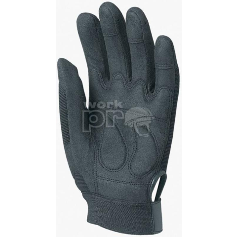 FEKETE SZINTETIKUS BOR SOFORKESZTYU:fekete szintetikus bőr nagy igénybevételre (60% kopásálló PA, 40% könnyű PU)szivaccsal párnázott tenyér, artéria- és körömvédőrugalmas fekete poliészter kézhátelasztikus mandzsetta, állítható tépőzáras szegéllyelMÉRET: 8-asCSOMAGOLÁS: 120/12EU szabvány: EN420, EN388: 3122