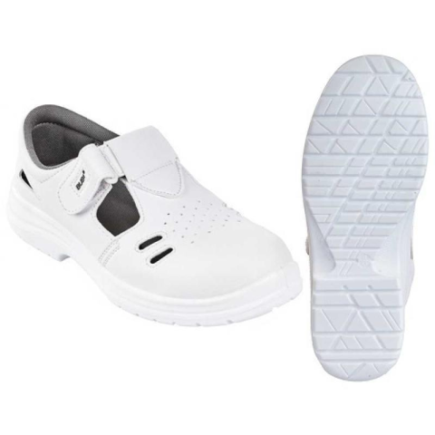 BUBI (O1 SRC) SZANDÁL:fémmentes, tépőzáras szandálfolyadékoknak jobban ellenálló, kiválóan szellőző fehér mikroszálas felsőrészantisztatikus, olajálló, hajlékony, kétrétegű, fehér PU talp, ütődéselnyelő sarokkalnedves acél és kerámia felületekre bevizsgált, SRC fokú csúszás elleni védelem, kényelmes talpbéléskönnyű súlyú, egészségügyi, élelmiszeripari munkákhoz, egész napos viseletre ajánlott védőlábbeliszivaccsal párnázott bokarész, szell