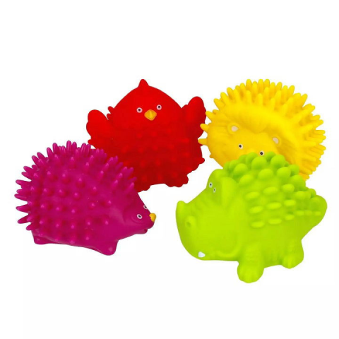 A különböző formájú oroszlán, sündisznó, víziló és csirke formájú figurák változatosságot és sokrétű érzékszervi élményt nyújtanak a gyermeknek, támogatva az érintés és a kézügyesség fejlődését.