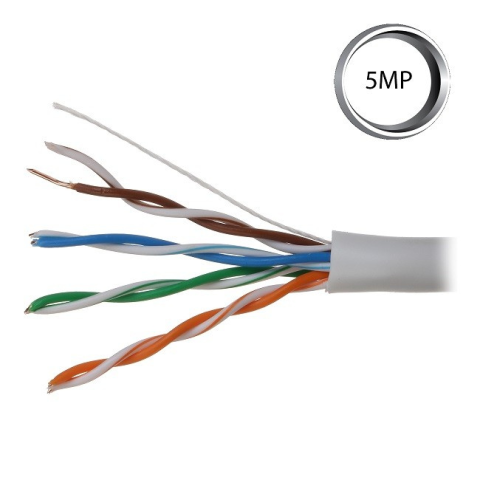 UTP kábel 5 és 8 megapixel felbontású kamerákhoz, rendszerekhez Fali, tömör réz eres UTP kábel, mely 8 megapixeles felbontásig alkalmas továbbítani a kamera képét, és áramellátását. Típus: Cat5e Anyaga: Oxigénmentes réz (99,97%-os tisztaság) Átmérő: 0