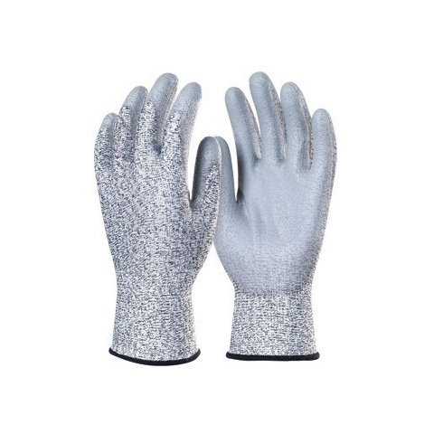 Tenyerén szürke, kopásálló, vágásbiztos, PU-val mártott kesztyü Cikkszám: 1CRAG - erös szakítás- és kopásállóságú, vágásbiztos, 13-as kötésü multiszálas (65% HPPE, 25% nylon, 10% spandex) alapkesztyü - tenyerén szürke, kopásálló PU-val mártott - szel
