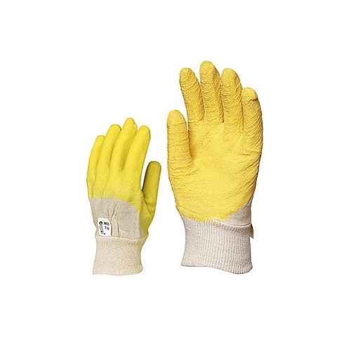 Sárga krepp latex vágásbiztos, csúszásgátló, szellőző hátú kesztyű Cikkszám: 3800 - szövött pamutra ökölcsontig mártott sárga latex - gumírozott mandzsetta - szellőző kézhát - vágásbiztos - csúszásmentes érdesítés Méret: 10-es EU szabvány: EN420, EN