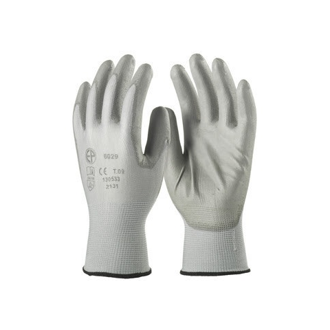 Tenyéren mártott poliuretán kesztyü, szürke Cikkszám: 6026-32 - kötött, rugalmas, nagy szakítószilárdságú 100% nylon szál - tenyéren szürke poliuretánnal mártott - szürke, 13-as kötésü, precíziós kesztyü gumírozott mandzsettával, szellözö kézháttal
