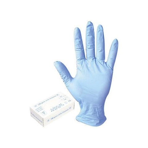 Nitril kesztyű, púderozott, kék 100 db Cikkszám: 5906 - egészségügyi, egyszerhasználatos nitril púderozott belsővel - vegyszerálló - rugalmas - mindkét kézen használható - mikroorganizmusok elleni védelem - 0,125 mm vastag - 23 cm hosszú - AQL: 1,5 -