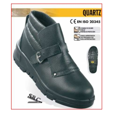QUARTZ (S3 SRA) lábfejvédős bőr hegesztőbakancs, gyorscsattal Cikkszám: 9QUAR - vízlepergető, fekete bőr bakancs hegesztési munkálatokhoz - olaj- és saválló, antisztatikus, SRA csúszásmentes, hőálló (180 °C) kétrétegű PU talp - Szellőző, hálós kialak