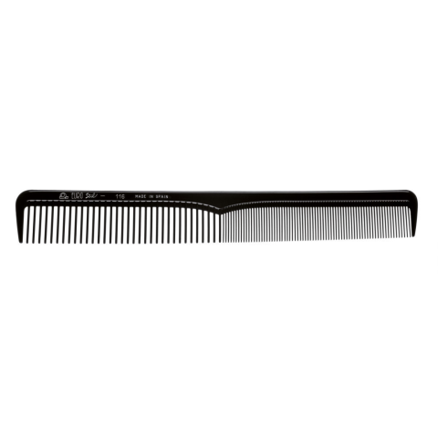 Professzionális hajvágó fésű. Az Eurostil 00116 fésű egy professzionális hajvágó fésű, amely kiválóan alkalmas a haj bontására, kontyok fésüléséhez és minden fésűvel történő fodrászati munkához. A fésű hossza 19,5 cm, és fekete színben kapható. A fésű