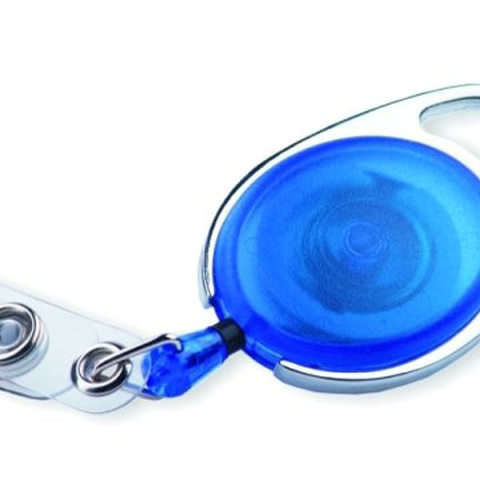 Visszahúzható kulcstartó - fém krómozott/műanyag testű orsó, hurokkal a címke, ID kártyák, kulcsok felakasztásához, stb. a merevítő szélessége 12 mm, az orsó ovális testének átmérője 37 mm, mélység 8 mm, kék szín, kábel hossza kb. 700 mm, az orsó felső oldalán praktikus fogantyú a ruházatra történő felakasztáshoz