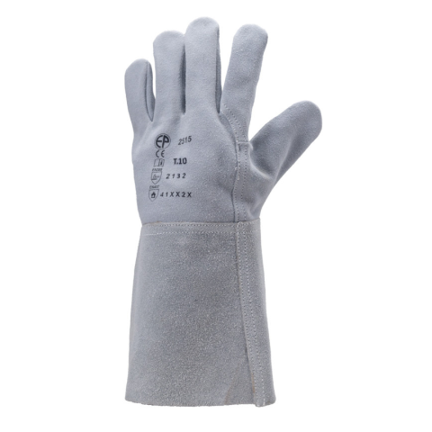 Hasított marhabőr kesztyű széles biztonsági mandzsettával. Védelem a szikrázástól, a hőtől (100 °C-ig) és az olvadt fémcseppek ellen. A kesztyű hossza 35 cm, melyből 15 cm-es a marhahasíték mandzsetta. Alkalmas: Hegesztés, építőipari - befejező munkák