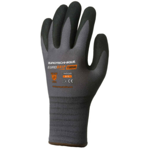 EUROGRIP • szürke nylon-spandex alapanyagú kesztyű • tenyerén fekete nitril mártás + fekete Sandy csúszásbiztos nitril réteg • könnyű, kifejezetten kényelmes, teljesen kézre simuló formai kialakítás, magas kopásállósággal és továbbszakítóerő elleni védele