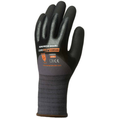 EUROGRIP • szürke nylon-spandex alapanyagú kesztyű • ökölcsontig fekete nitril mártás + a tenyerén fekete Sandy csúszásbiztos nitril réteg • könnyű, kiemelten komfortos, teljesen kézre simuló formai kialakítás, magas kopásállósággal és továbbszakítóerő el