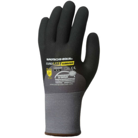 EUROLITE • 15-ös kötésű, erős szakítás- és kopásállóságú szürke nylon / spandex • ökölcsontig fekete szellőző mikrohabosított nitrillel mártott, tenyerén csúszásbiztos pettyekkel • szellőző kézhát, gumírozott mandzsetta • könnyű, kiemelten komfortos, telj