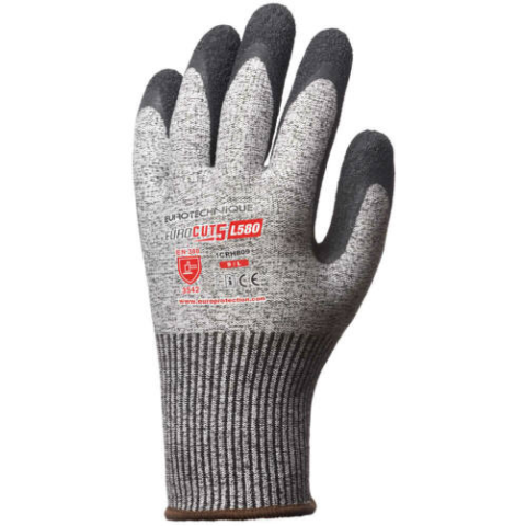 2 kép EUROTECHNIQUE Szürke 5-ös szintű vágásbiztos tenyerén fekete krepp latex kesztyű