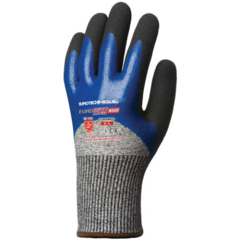 EUROCUT • 13-as kötésű, legmagasabb szintű szakítás- és kopásállóságú, szúrásbiztos illetve maximális 5-ös szinten vágásbiztos HPPE (high performance PE) + üvegszál alapanyagú védőkesztyű • ökölcsontig kék sima nitril mártás + a tenyerén fekete speciális