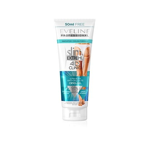 Testápoló gél - masszírozó és regeneráló, zsíros, normál, kombinált, száraz és érett bőrre alkalmas, narancsbőrre ajánlott, 250 ml-es kiszerelésben Számolj le a cellulitisszal a Slim Extreme 4D Clinic Anti-Cellulite Cryo-Gel testápoló krémmel, amelyet az Eveline Cosmetics készített. Magasan koncentrált aktív összetevői, a Bio-Slim,